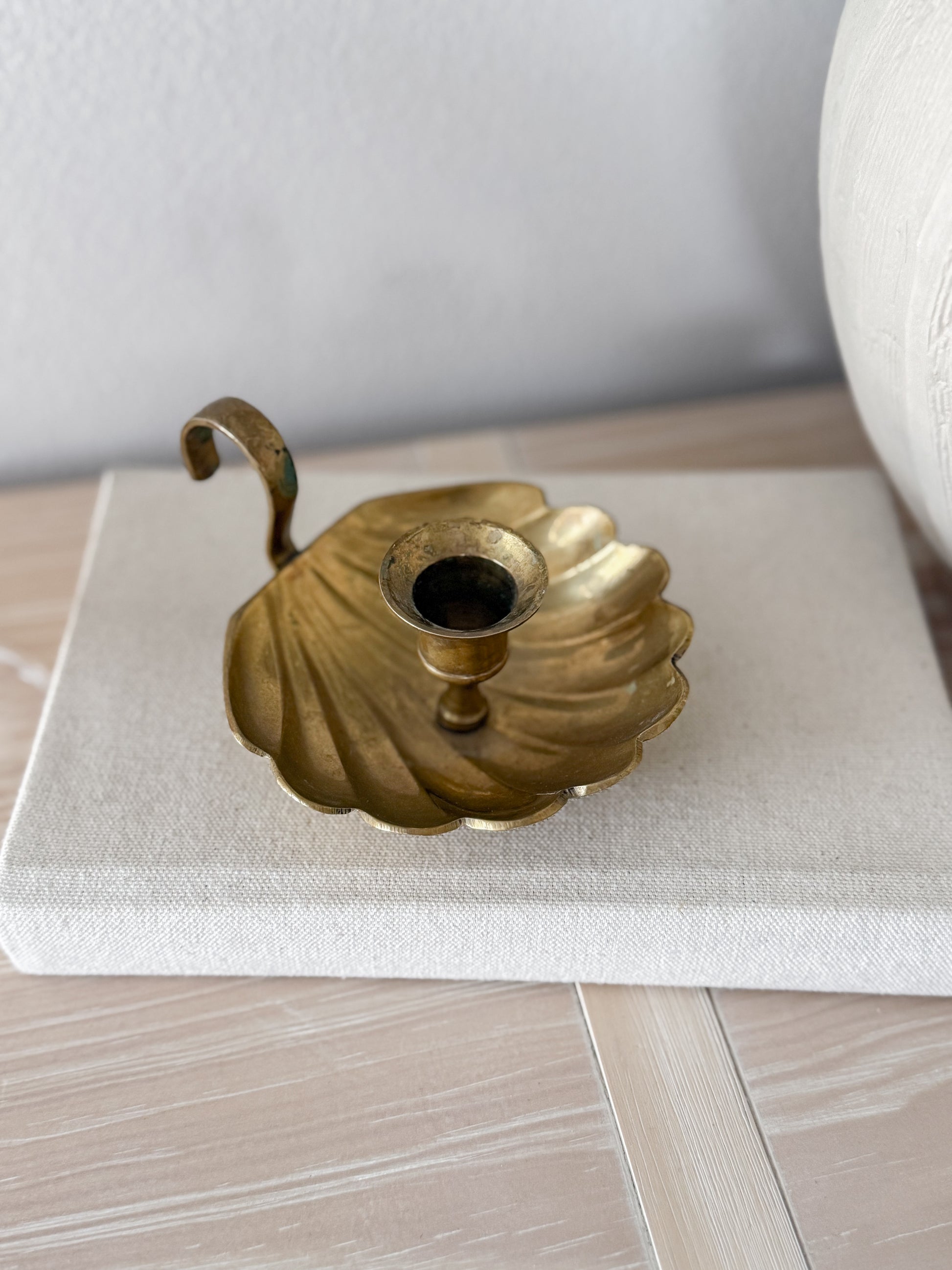 Vintage brass shell candleholder with finger loop (5.25”) *some wear/patina present due to age